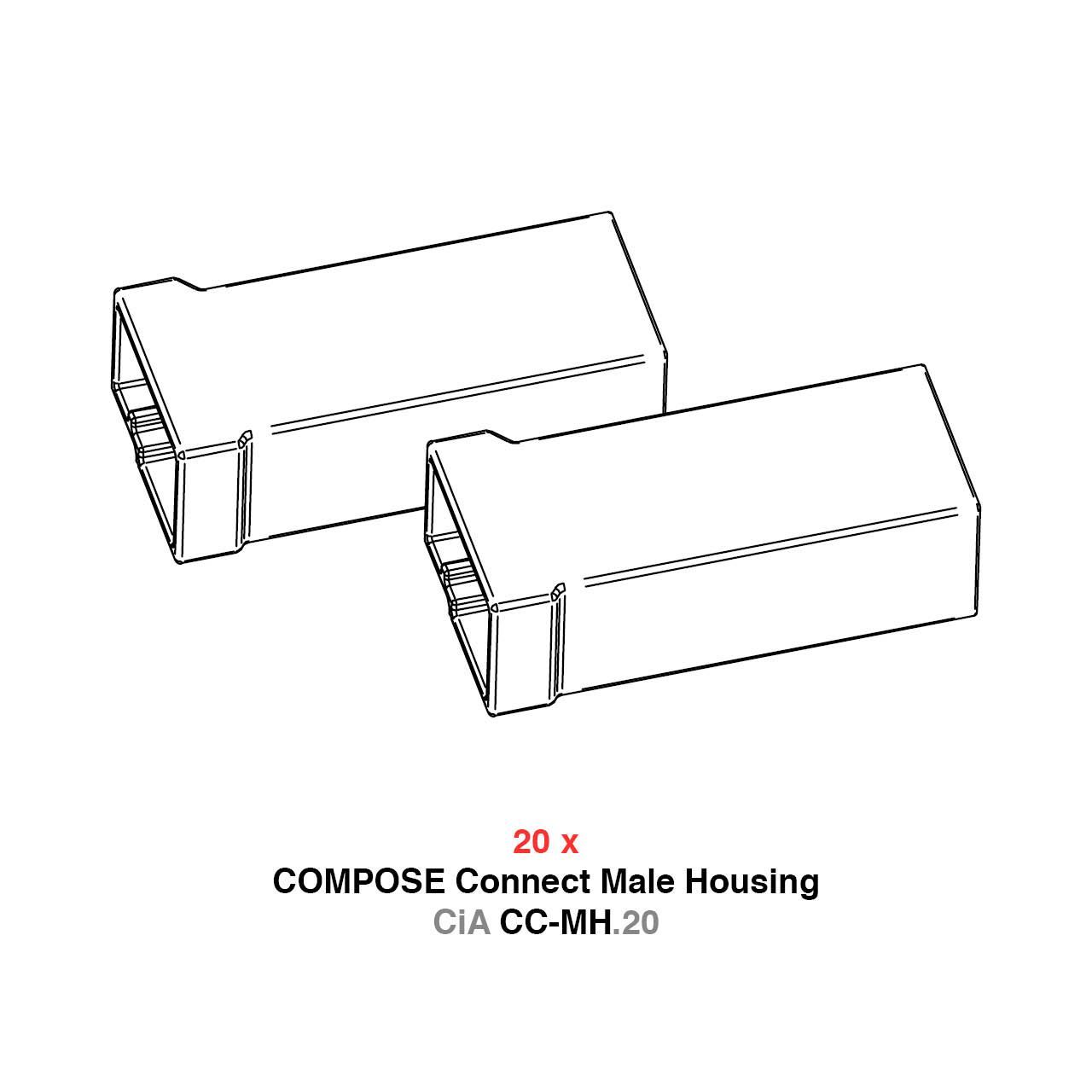 The set consist of 20 high-quality plastic housings into which the COMPOSE Connect male crimp contacts (CiA CC-MC.20) and COMPOSE Connect female housings (CiA CC-FH.20) can be snapped, allowing you to create a polarity reversal-proof and absolutely reliable connection according to automotive standards.